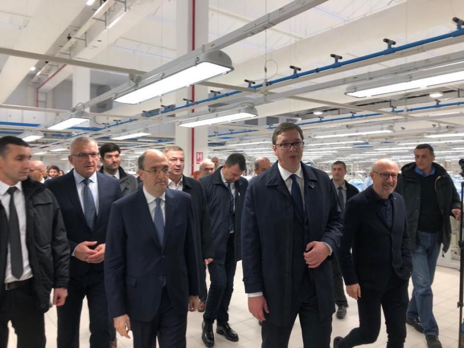 Nella foto, in prima fila da sinistra: l’Ambasciatore dell’Italia in Serbia, Carlo Lo Cascio, il Presidente serbo, Aleksandar Vucic e Sandro Veronesi, fondatore e presidente del Gruppo Calzedonia