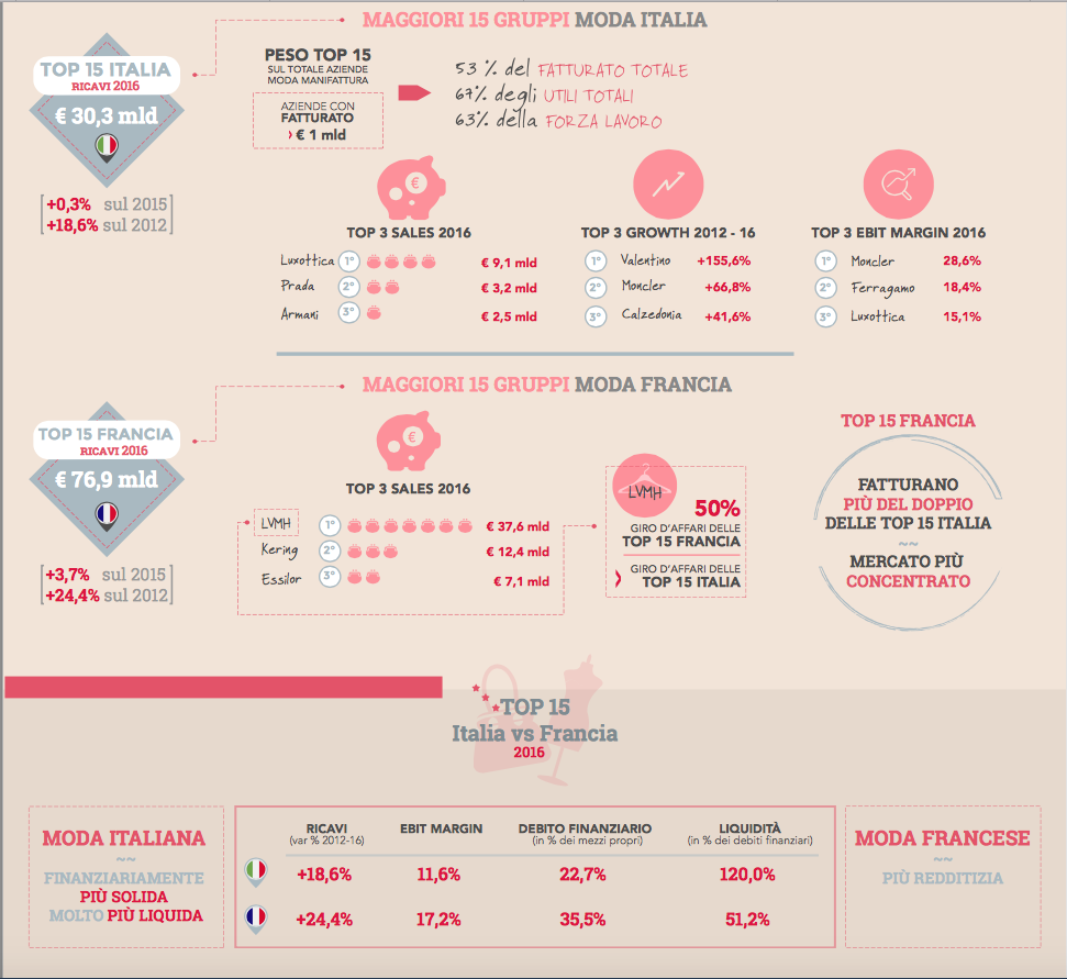 I 15 maggiori gruppi italiani rappresentano il 53% del fatturato aggregato delle aziende moda Italia manifattura, il 67% degli utili e il 63% della forza lavoro. Nel 2016 il giro d’affari di queste società ha raggiunto i 30,3 miliardi, e le esportazioni hanno registrato le performance migliori, soprattutto in area extra-europea (+24,5% rispetto al 2012).