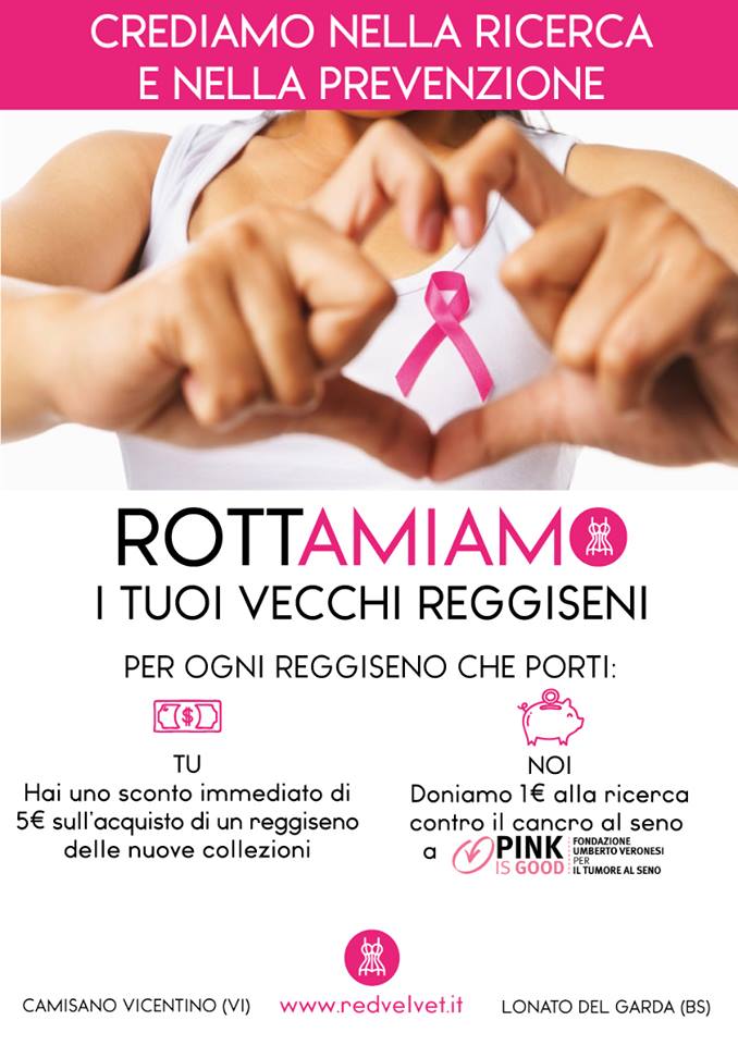 Con l’iniziativa denominata “Rottamazione del reggiseno”, anche Red Velvet Lingerie, la società specializzata nella vendita di intimo e beachwear, lo scorso ottobre ha dato il suo contributo alla prevenzione del tumore al seno. L’operazione ha coinvolto i due punti vendita di Camisano Vicentino (Vi) e Lonato del Garda (Bs).