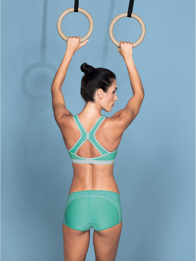 Completamente imbottite e regolabili sul davanti, le spalline si collocano lontano dal collo e formano una X sul dorso, foderata in rete CoolMax ad asciugatura rapida e che forma un tutt’uno con le cuciture laterali. Questo incrocio offre maggior sostegno sui lati e assicura un effetto “alleggerente” particolarmente percepibile soprattutto durante un’attività sportiva intensa, oltre a rendere il reggiseno comodo da indossare e da togliere. Al reggiseno è abbinato lo slip sportivo, con inserti laterali in rete che veicolano ottimamente il sudore verso l’esterno, e i leggings sport tights fitness.