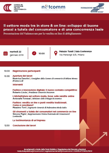 All’evento, che verrà aperto da Beatrice Zanolini, consigliere della Camera di commercio di Milano Monza Brianza Lodi, interverranno: Roberto Liscia, presidente Consorzio Netcomm con una relazione sul tema”Fashion e innovazione digitale: il nuovo contesto competitivo”; Antonella Tomassi, del ministero dello Sviluppo economico. invece, parlerà di “L’etichettatura nel settore moda, focus sulle vendite online”; Massimo Torti, segretario generale di Federazione Moda Italia affronterà il tema “Fashion: vendita on line e punti vendita tradizionali. Come si conciliano?”; Simona Pigini, rappresentante Unione Nazionale dei Consumatori Lombardia, infine, illustrerà “Gli strumenti a tutela dei consumatori nel commercio online”.