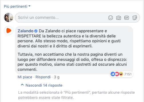 Per interrompere l’attività degli hater, Zalando è intervenuta con un commento al suo stesso post;