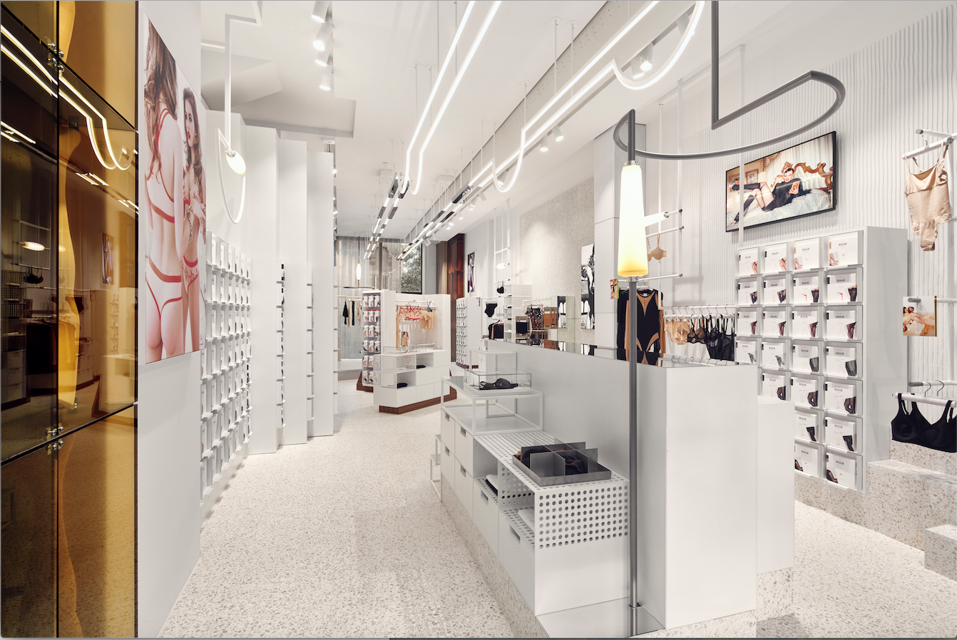 Le scaffalature fatte su misura con cassetti integrati sono progettate in modo da dare risalto ai nuovi pack. I clienti sono così incoraggiati a trovare la propria tonalità di nude, sperimentando e toccando con mano il tessuto. Le strutture e le lampade a forma di rocchetto sono ispirate alla sede produttiva di Wolford. File infinite di lampade a led con una copertura di metallo a forma di L contraddistinguono il soffitto. Rocchetti di vetro soffiato replicano il design e la forma dei fili delle bobine presenti in azienda e fungono da riferimento iconografico per l’abilità, l’innovazione e l’artigianato che fanno parte del patrimonio di Wolford.