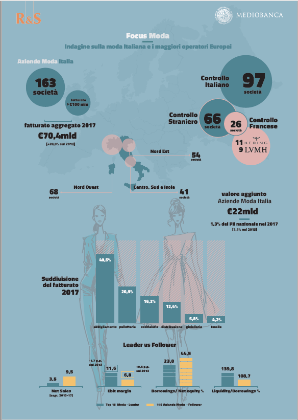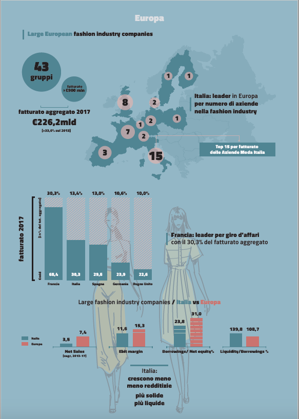 Nel periodo 2013-2017, i 43 principali gruppi europei della moda hanno registrato ricavi aggregati per 226,2 mld (+33% sul 2013). Nonostante l’Italia con le sue big 15 sia il paese più rappresentato a livello numerico (oltre un terzo del totale), è la Francia, con il 30,3% del fatturato aggregato, ad aggiudicarsi il primato per giro d’affari (favorita anche dal formidabile apporto dei marchi italiani acquistati dai colossi francesi). Sul podio anche Italia( 13,4%) e Spagna(13%), entrambe doppiate dalla Francia.