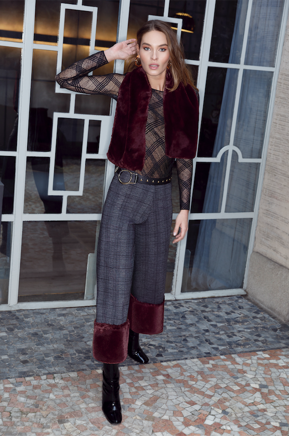 Leggings e pantaloni sono suggeriti in punto milano, in geometrie pied de coq e chevron, in tessuto similpelle, tecnico con bordi di ecopelliccia, in animalier e zebrato black&white e nella fluidità del cadì, che regala forme uniche a pantapalazzo e a casacche.