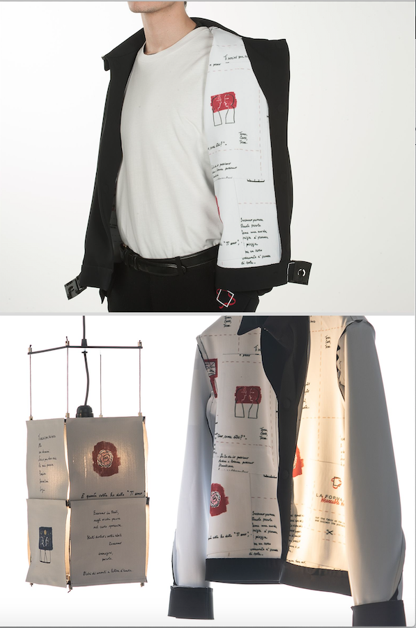 La Forma – Wearable Words, invece, è il progetto che propone un giubbotto internamente decorato da frammenti di lettere dal fronte di guerra. Realizzato in tessuti Sensitive Fabrics con termosaldature, il giubbotto può essere utilizzato anche come un paralume per una lampada da interni.