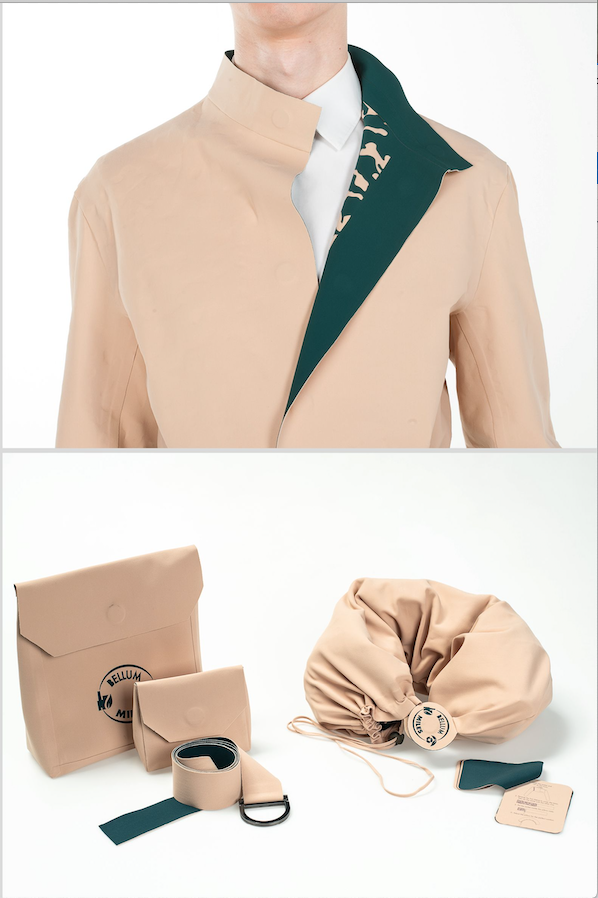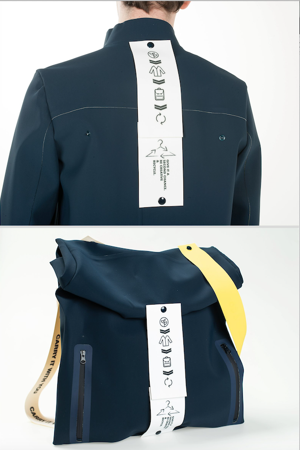 Mimetismo e reinterpretazione dell’uniforme militare è l’inspirazione del progetto di Elena Balbarau che ha realizzato una giacca multifunzione in tessuti Sensitive Fabrics. Pensata con un approccio sostenibile, la giacca ripiegandosi si trasforma in un comodo cuscino da viaggio.