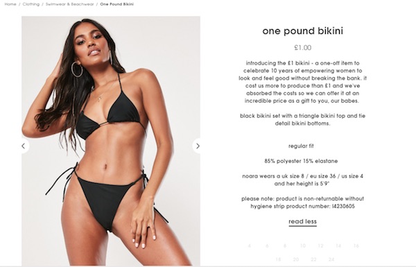Per celebrare il suo decimo compleanno Missguided, marchio inglese di fast fashion, ha deciso di vendere nel suo shop online un bikini al prezzo speciale di 1 pound, pari a 1,12 euro.