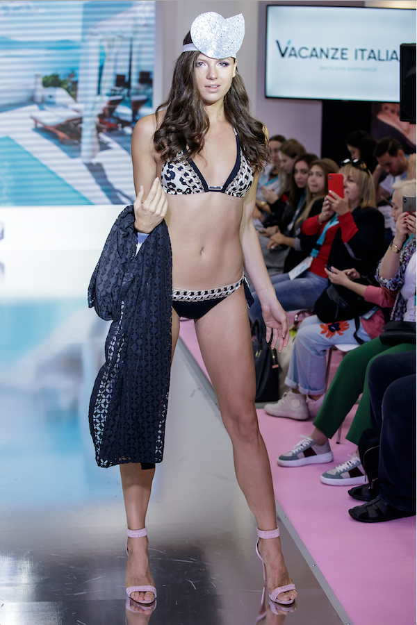 I costumi Vacanze Italiane, invece, hanno sfilato nel padiglione Body&Beach, dedicato alle aziende italiane. Per la passerella sono stati selezionati i capi di punta della collezione: bikini in pizzo nero sul color nudo, impreziositi da ricami gioiello.