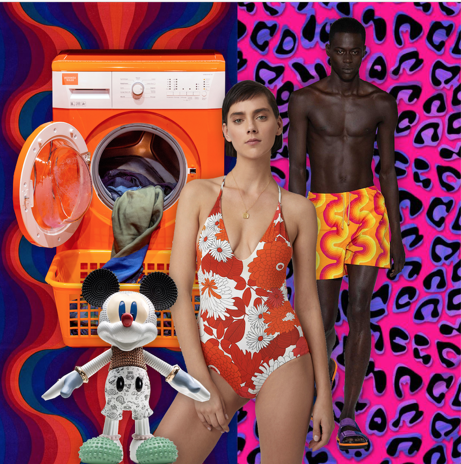 Flow Culture propone un’estetica che celebra la malizia della vita da strada, appropriandosi di un design e di un retro-design popolari e contemporanei. Questo nuovo linguaggio è strettamente funzionale a raccontare la propria personalità instagrammabile. Canotte semplici, costumi olimpionici e halter, boxer, giubbini e t-shirt, affiancati da bikini a triangolo e a fascia sono gli articoli che meglio esprimono l’identità diquesto tema. I colori, invece, sono vibranti e audaci: la palette spazia dal fucsia al blu oltremare, dal ciliegia all’arancio e al giallo sole. Le stampe combinano gli stili degli anni 60, 70 e 90: fantasie floreali, semplici stampe a cuore, labbra, occhi, grafiche che alternano testi e righe si affiancano a richiami a Verner Panton, alla pubblicità di Barilla, ai Pokemon, a Ikea, Etro e Valentino.