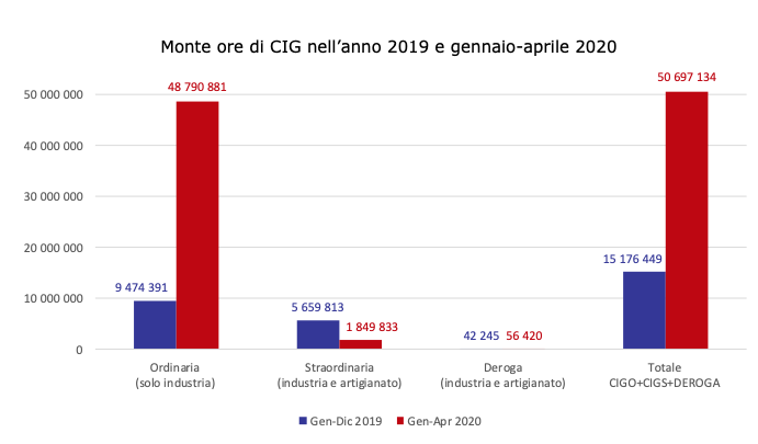 Analizzando la tipologia di cassa integrazione richiesta si nota che ad avere un aumento consistente è stata la cassa integrazione ordinaria, che passa da 9.474.391 ore nell’anno 2019 a 48.790.881 per il primo quadrimestre 2020. Calano, invece, le ore di cassa integrazione straordinaria e aumentano, ma in modo meno considerevole, quelle in deroga.