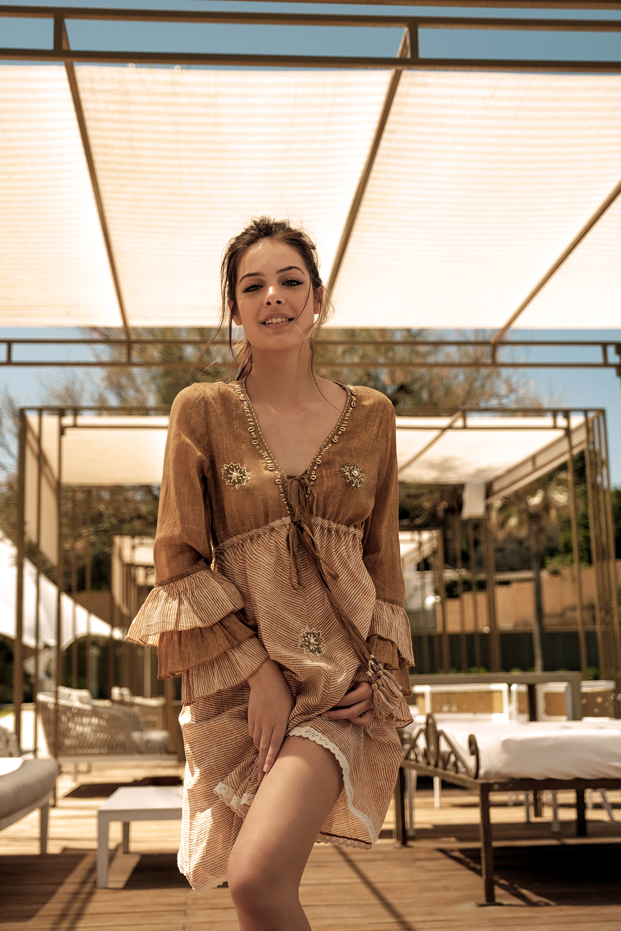 I capi della seconda collezione del brand sono sviluppati nel segno dell’artigianalità e della ricerca: i ricami sono fatti a mano, i tessuti sono naturali. Cotone, lino e pizzo sangallo danno vita a kaftani, abiti, bluse da indossare al mare ma anche in città o nelle più disparate situazioni.