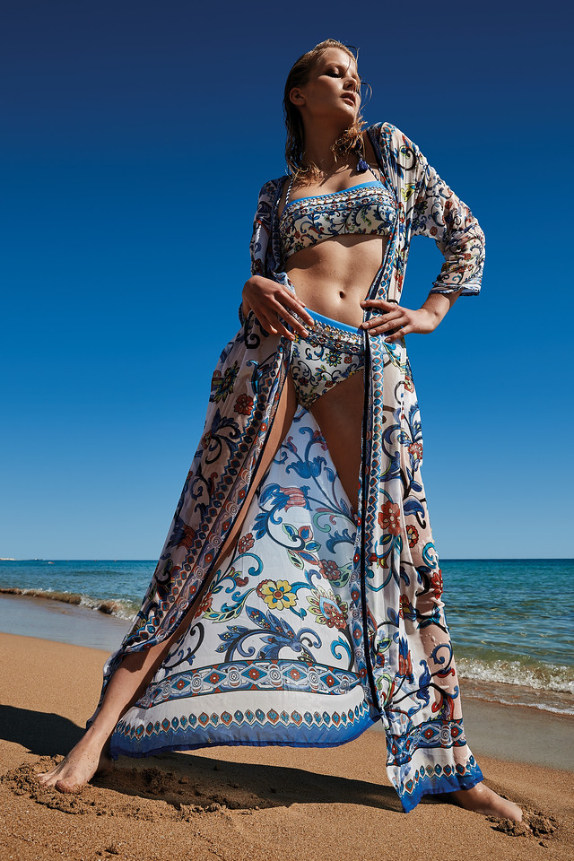 Capri Summer, invece, è un’ode alla splendida isola, destinazione privilegiata per vacanze di lusso. La serie presenta un freschissimo disegno ispirato al design murale delle ville capresi. Disponibile anche in una variante a fondo nero, la gamma è arricchita da preziosi ricami a mano e copricostumi in pura seta.