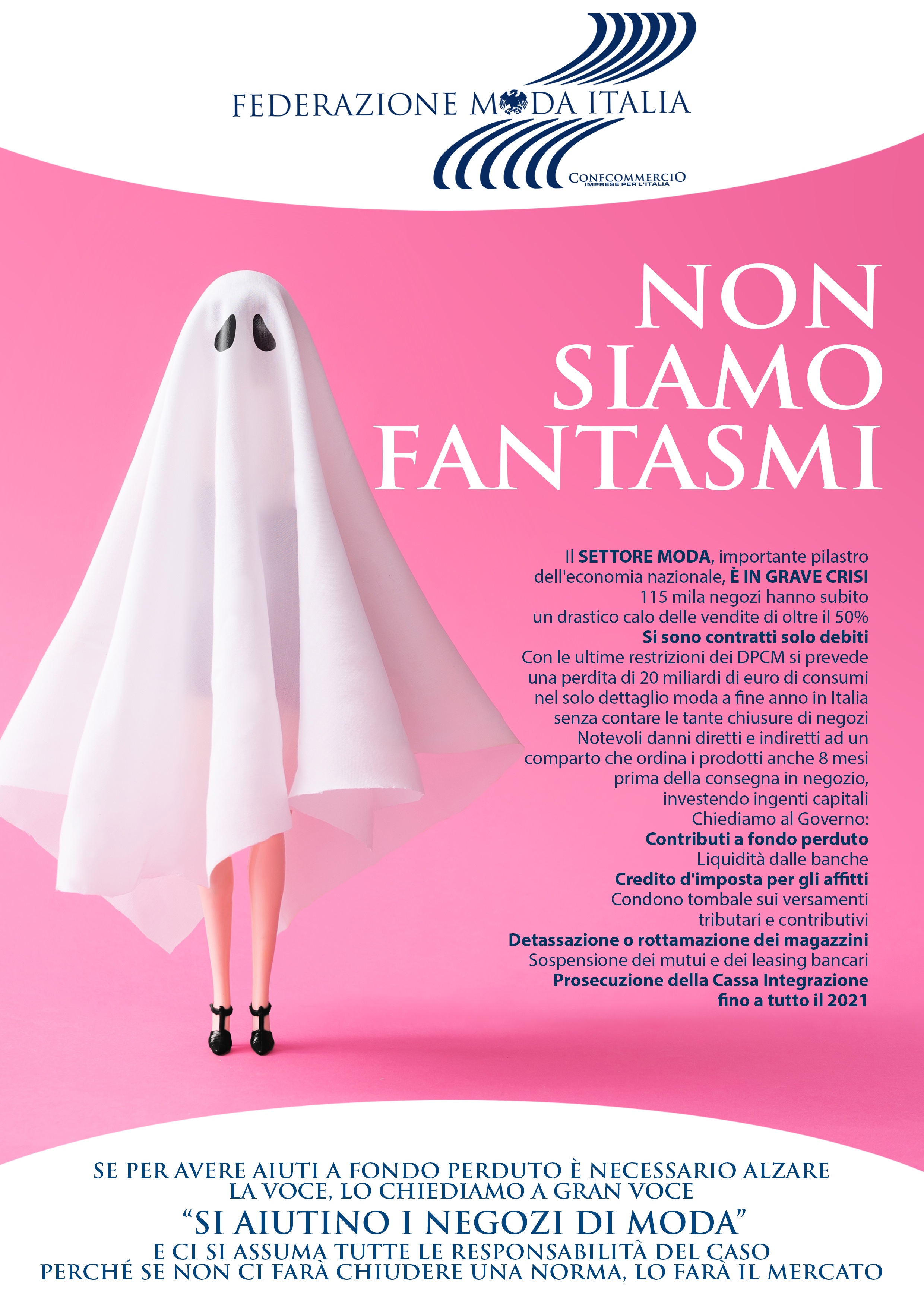 Con la campagna #nonsiamofantasmi Federazione Moda Italia, infatti, denuncia anche l’atteggiamento delle istituzioni che sembra non si accorgano dei gravi danni subiti dai “negozi di moda che vivono di collezioni stagionali e hanno investito ingenti capitali in prodotti che rischiano di restare fermi sugli scaffali”. Nell’ambito della campagna, la federazione ha messo a disposizione delle associazioni territoriali una locandina/folder da esporre in vetrina e da postare sui canali social dove si legge, “se per avere aiuti a fondo perduto è necessario alzare la voce, lo chiediamo a gran voce: si aiutino i negozi di moda. E ci si assuma tutte le responsabilità del caso perché se non ci farà chiudere una norma. Lo farà il mercato”.