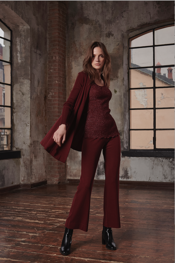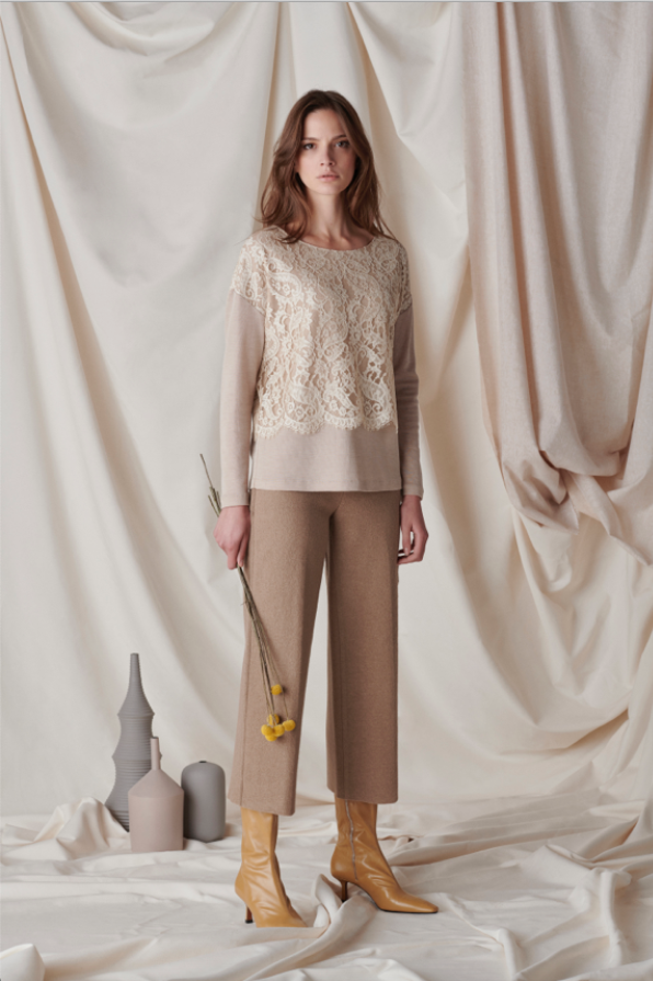 Il Dna del brand si esplicita in capi che utilizzano in modo raffinato motivi macramè, taffetà ricamato, laize di pizzo Chantilly, tulle ricamati e Leavers abbinati al tessuto lana/seta proposto sia a costina sia liscio. Nella collezione Oscalito FW 2021 trovano posto anche punti maglia dallo stile più essenziale, che offrono vestibilità più ampie e comode, cui si aggiungono maglie calate in alpaca, in lana seta cashmere semplici o impreziosite da pizzo chantilly.