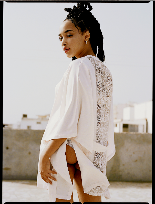 Nei capi della linea Thelma, la sensualità è garantita dal gioco di trasparenze dato dall’impiego di un delicato pizzo floreale. La palette colori include due tonalità: talco e goyave.