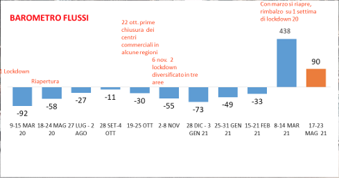 Di fatto, la settimana dal 17 al 23 maggio è la prima effettivamente confrontabile con quella della riapertura dello scorso anno: il lungo lockdown nazionale iniziato nel mese di marzo si era infatti concluso il 18 maggio.