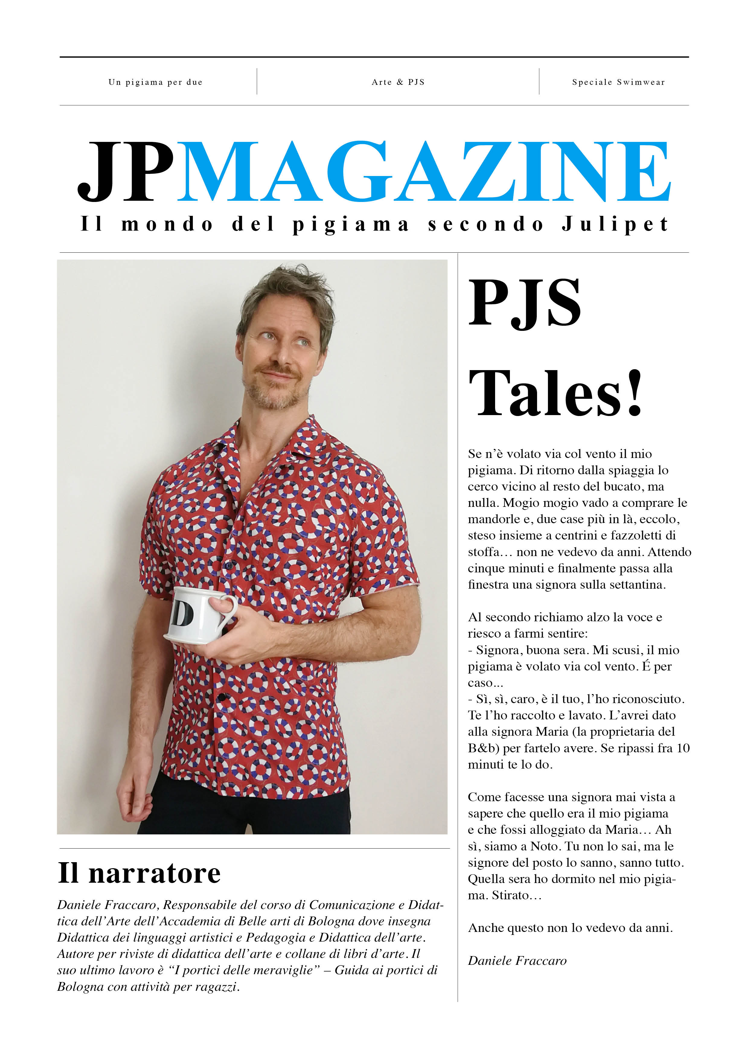 Scaricabile gratuitamente dal sito www.julipet.it, nella sezione blog, nel suo primo numero “JPMagazine – Il mondo del pigiama secondo Julipet” affida il racconto di “PJ Tales” a Daniele Fraccaro, responsabile del corso di Comunicazione e Didattica dell’Arte dell’Accademia di Belle arti di Bologna dove insegna Didattica dei linguaggi artistici e Pedagogia e Didattica dell’arte. La rubrica “Un pigiama per due”, invece, vede confrontarsi in un faccia a faccia generazionale Ettore e Agostino Trucco, mentre nelle pagine “Art&Pjs: l’arte non ha confini” Fabio Raimondi, fashion designer e responsabile stile e prodotto del marchio Julipet, spiega come nasce una collezione. Chiude il numero uno speciale dedicato alla collezione estiva.