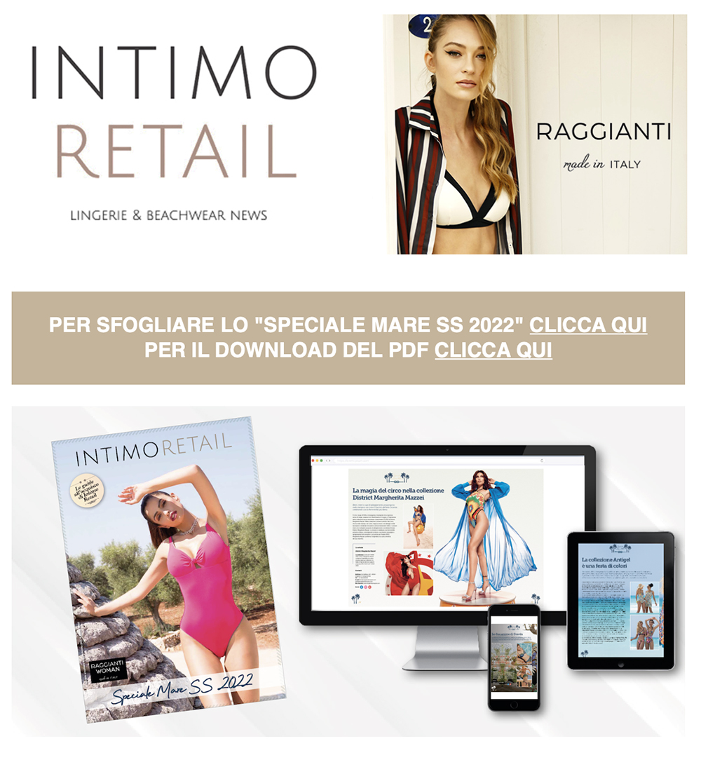 Allegato al numero di luglio/agosto di Intimo Retail in questa edizione dello Speciale Mare la cover story è dedicata a un’azienda italiana: Carletti Fashion a cui fanno capo i marchi Raggianti, laRaggiantina, Raggianti Woman e GPM. Nell’articolo interno vengono presentate i tratti distintivi dei vari brand con cui il fondatore dell’azienda, Franco Carletti, ha sviluppato un progetto completo e articolato per offrire ai partner del retail bikini e interi Made in Italy in coppe differenziate: in alcune linee, infatti, i costumi sono disponibili anche in coppa E.