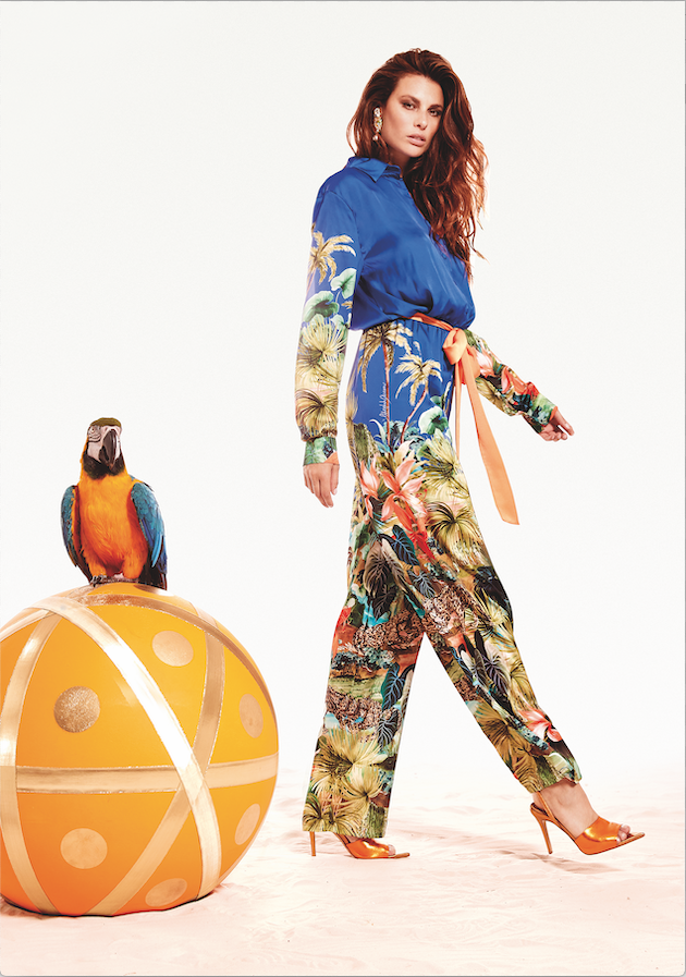 Infine, per l’estate 2022, il marchio Made in Italy propone anche una tuta a manica lunga con collo camicia in raso di poliestere con stampa jungle piazzata e logata.