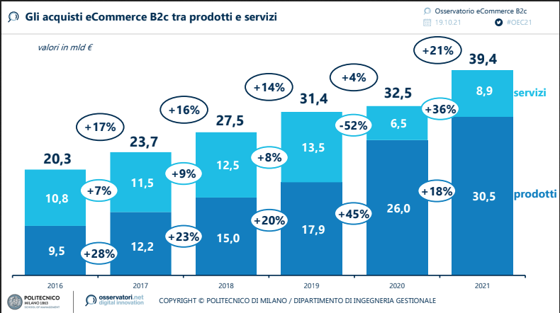 In Italia l’e-commerce B2C torna a crescere con un ritmo simile a quello pre-pandemia: ad oggi, gli acquisti online valgono 39,4 miliardi di euro, in crescita del 21% rispetto al 2020. Da un lato le vendite di prodotto continuano ad aumentare, sebbene con un tasso più contenuto (+18%) rispetto a quello dello scorso anno (+45%), e toccano i 30,5 miliardi di euro. Dall’altro, dopo la forte crisi del 2020, gli acquisti di servizi segnano una ripresa (+36%) e raggiungono gli 8,9 miliardi di euro. Rimane però ancora significativo il divario rispetto al 2019 quando le vendite online di servizi si attestavano a quota 13,5 miliardi.