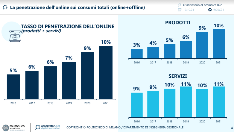 Nel 2021 l’incidenza dell’e-commerce b2c sul totale vendite Retail ha raggiunto il 10%(era il 9% nel 2020). Nella sola componente di prodotto la penetrazione passa dal 9% del 2020 al 10% del 2021, con un incremento più contenuto rispetto a quello osservato tra 2019 e 2020 (+3 punti percentuali). Nel 2021, aumenta anche l’incidenza della componente servizio che passa dal 10% all’11%.