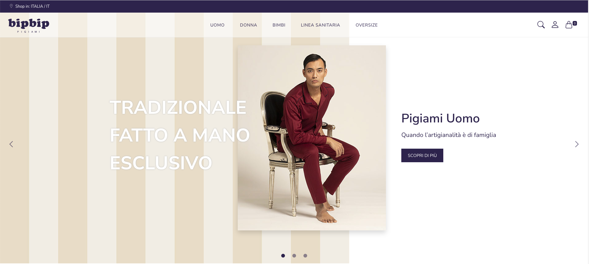 Responsive e con un design elegante ed essenziale, nella homepage dello shop online del marchio Made in Italy un posto di primo piano spetta alle linee di pigiami dedicate al pubblico maschile, prodotto core del brand. Seguono poi le sezioni “La nostra selezione”, con le novità di prodotto e “I più amati”, con i modelli bestseller. In questa sezione sono presenti anche alcuni capi BipBip per la donna: pigami dal taglio maschile in popeline di cotone rigato.