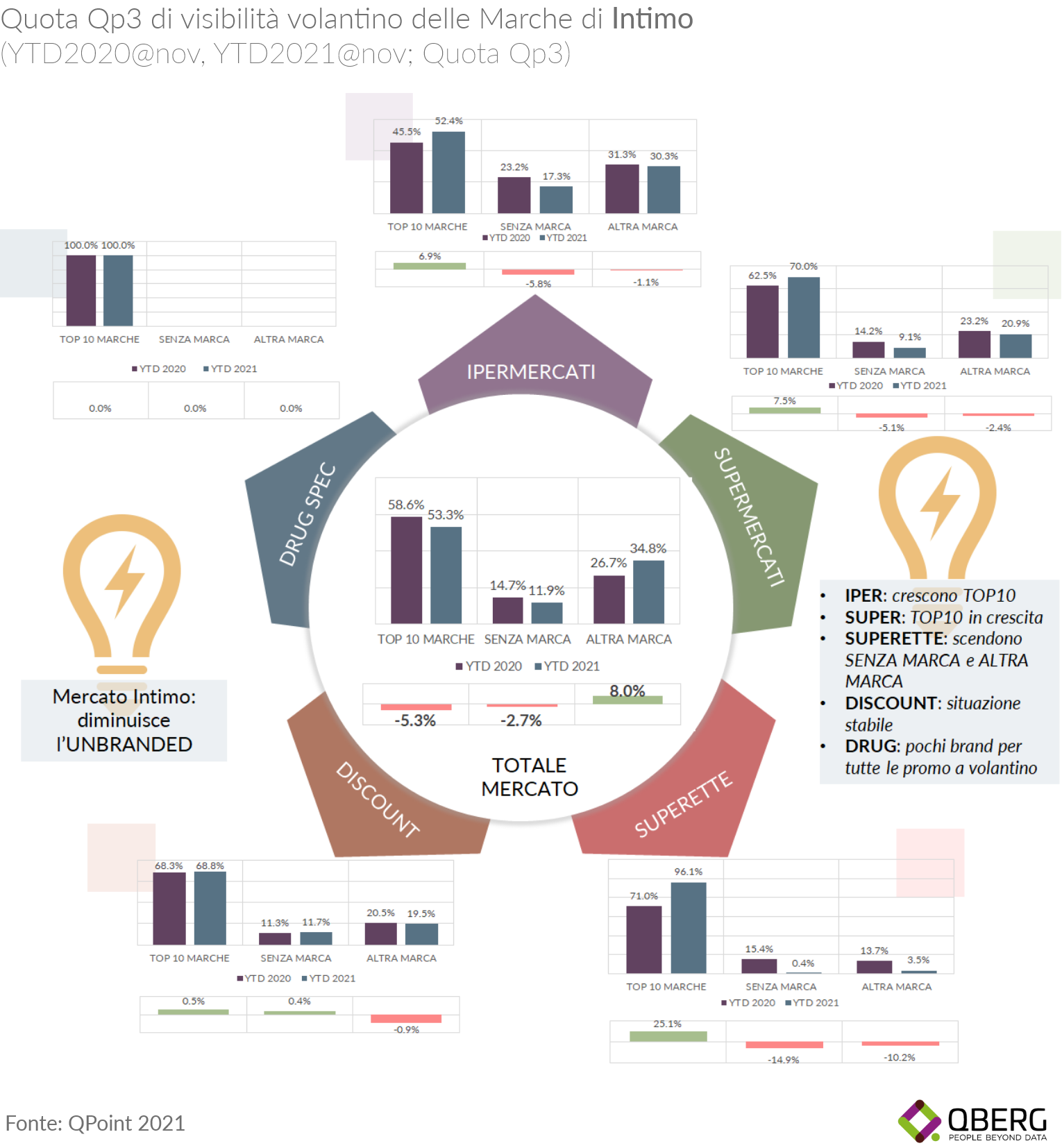 L’indagine di QBerg, infatti, rivela che i Top10 brand incrementano le loro quote di visibilità promozionale negli ipermercati, dove i prodotti “Senza marca” e le “Altre marche” conservano quote promozionali importanti; nei supermercati, dove invece la quota Qp3 dei prodotti “senza marca” è in calo e nelle superette. Soprattutto in quest’ultima tipologia di punto vendita, i Top 10 Brand conquistano la quasi totalità delle promozioni di Intimo. I discount, invece, rivelano una situazione sostanzialmente stabile fra il 2020 e il 2021 nel peso promozionale fra i tre diversi raggruppamenti di marchi analizzati. I drug specialist, invece, restano l’unico canale nel quale solo pochi marchi effettuano vendite promozionali a volantino.