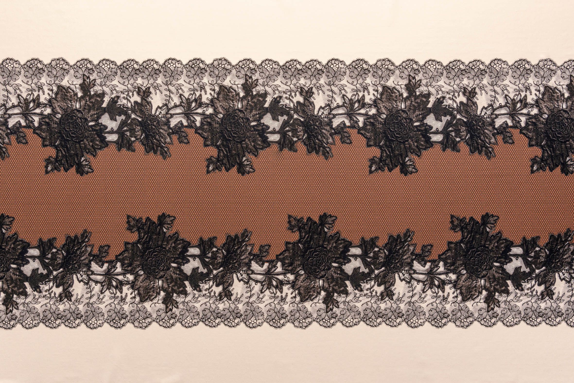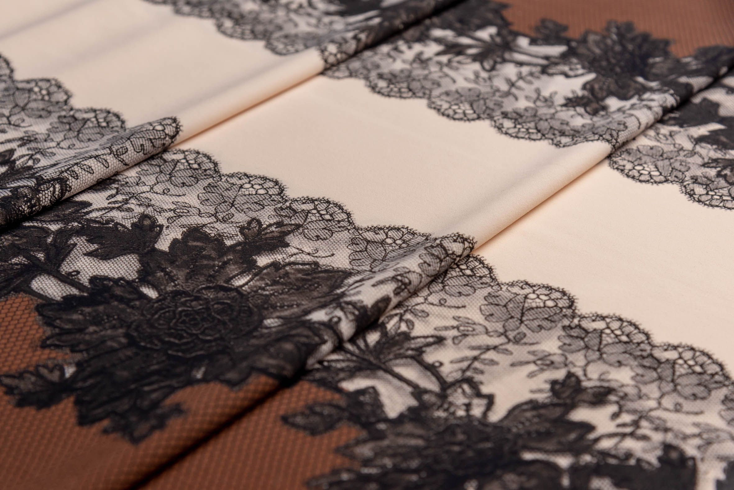 Placement Print, infine, consente il piazzamento stampato di un decoro direttamente sui tessuti Sensitive Fabrics: antichi pizzi chantilly, tricot, macramè e bordure da immagini digitali si trasformano in stampe riprodotte e piazzate sui tessuti con giochi di trasparenze e dettagli raffinati. Con questa tecnica il decoro può essere stampato e posizionato sul tessuto, seguendo la modellistica di un capo finito, evitando sprechi di tessuto in fase di taglio e confezione.