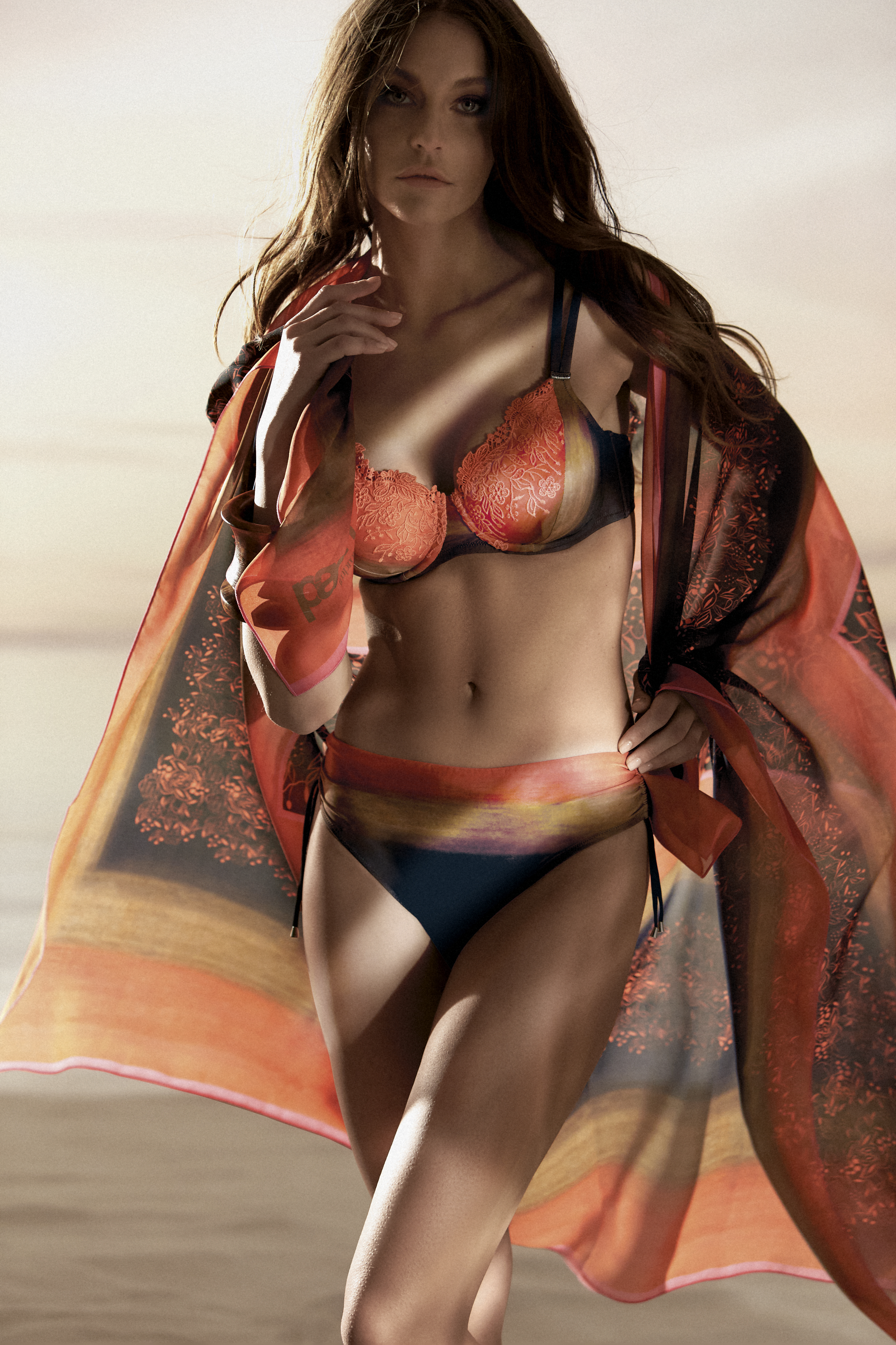 Nei capi Sunrise i tagli della stampa si intersecano agli inserti del ricamo e ridisegnano la silhouette con nuove proporzioni. La Lycra opaca, leggermente più compatta nella consistenza, conferisce sinuosità e slancio alla figura.