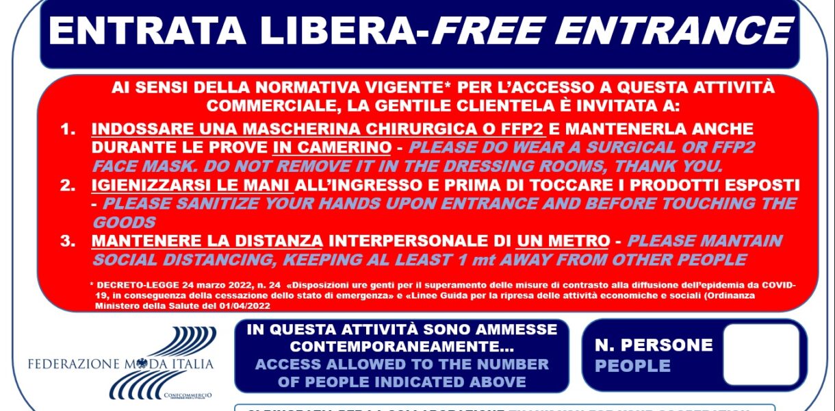 All’interno dei punti vendita è ancora necessario indossare la mascherina: chirurgica o FFP2 e, in caso di assembramento, anche all’aperto, ove previsto dalla normativa statale vigente.