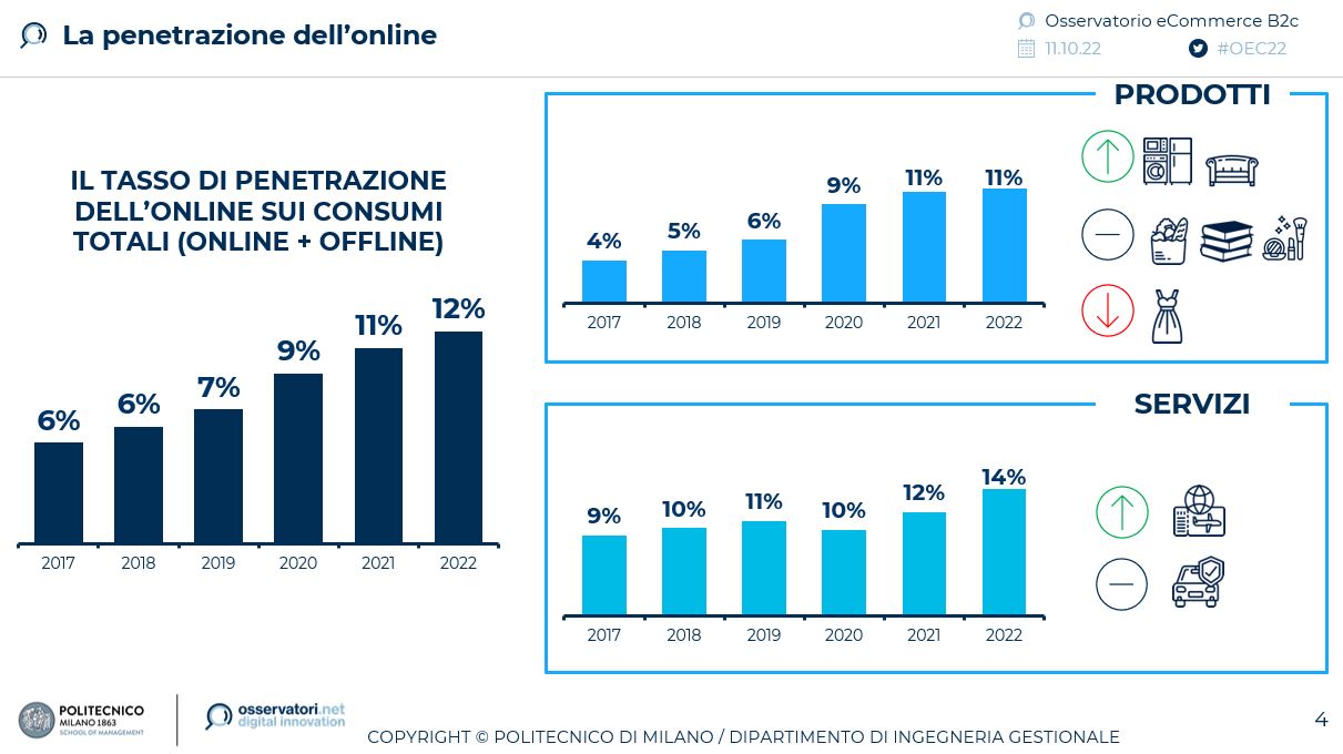 Per quanto riguarda invece il tasso di penetrazione dell’online sui consumi totali, il dato si attestsa al 12%. Più precisamente, nell’ambito dei prodotti, rispetto al 2021 il dato è stabile all’11%, mentre aumenta dal 12% al 14% quella nei servizi.