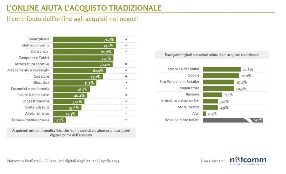 Oggi in quattro casi su dieci prima di fare un acquisto in un negozio fisico i consumatori consultano almeno un servizio online per acquisire informazioni. Questo aspetto riguarda principalmente prodotti e servizi che impegnano l’acquirente in un processo di selezione e di valutazione delle alternative, come l’elettronica e l’attrezzatura sportiva, categorie per le quali il fenomeno si rileva in più del 70% dei casi. Contemporaneamente, quasi un acquisto online su quattro (il 24%) viene influenzato da una visita presso un punto di vendita fisico.