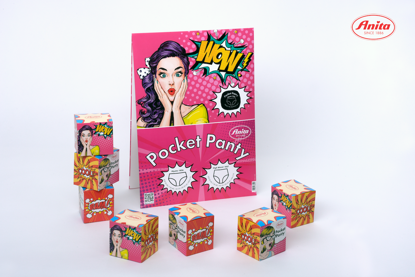 Per gli slip Pocket Panty, Anita ha realizzato un packaging colorato dal forte impatto visivo, all’interno dei quali lo slip è riposto già chiuso a pallina. Proprio per il suo design, il pack può essere utilizzato anche come confezione regalo. I colori e le immagini del pack ritornano anche nel flip stand da banco destinati ai punti vendita.