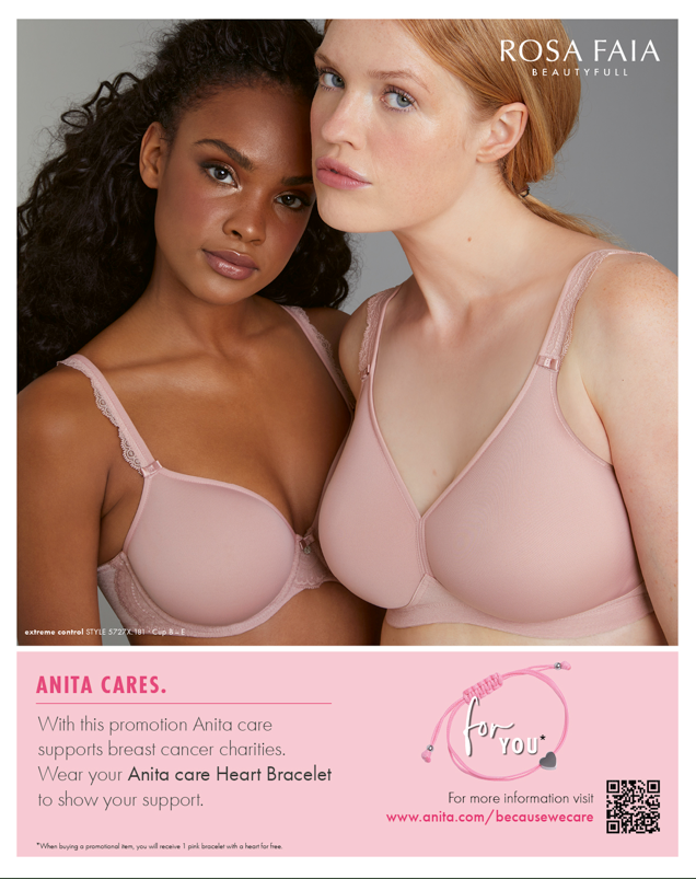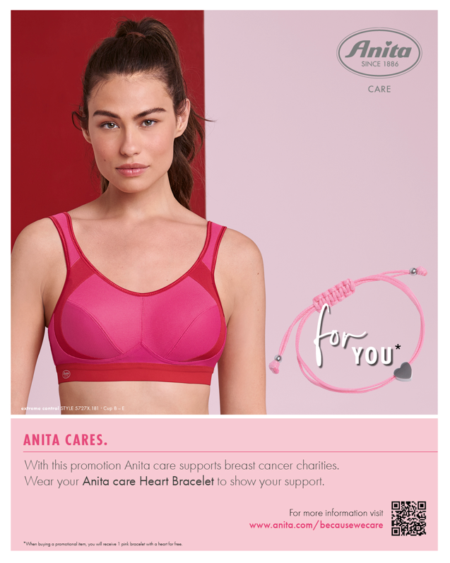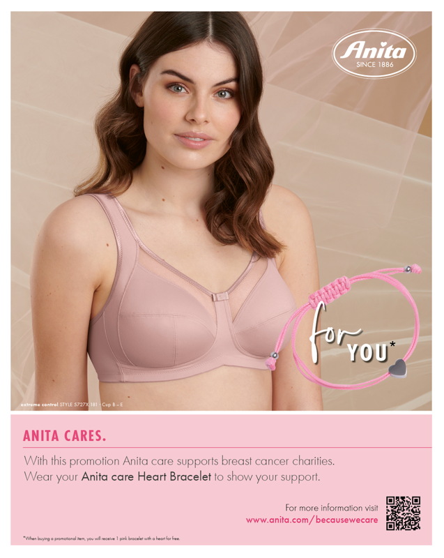 Per quanto riguarda i punti vendita di intimo e mare, i dettaglianti che aderiscono alla campagna “Beacause we care” ricevono entro i primi giorni di ottobre un kit con i poster per l’allestimento vetrina del punto vendita oltre ai file digitali per i canali social. Protagonisti di questi materiali sono gli articoli delle linee Clara, Clara Art, Essentials, Essentials Art, Essentials Lace, extreme control, Fiore, Fleur, Lotta, Lynn, Safina, Selma,Twin e Twin shaper, le serie best seller dei marchi Anita Since 1886, Anita Care, Anita Active, Anita Maternity e Rosa Faia.