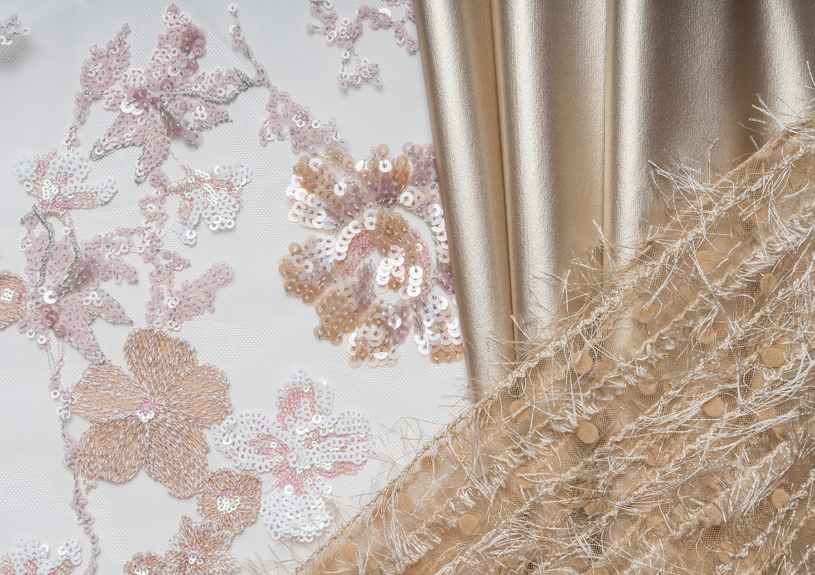 Il tema MU+ Interactive, invece, identifica tre concept che hanno un duplice approccio rispetto alla moda: da un lato si evidenziano le caratteristiche tecniche e di performance dei tessuti e dall’altro l’aspetto glamour e puramente estetico. La sperimentazione permette la trasformazione dell’activewear in uno stile glam, femminile, anche sexy e notturno, per la realizzazione di tessuti e accessori che abbiano non solo l’aspetto fashion, ma anche una vestibilità confortevole, alla ricerca di un equilibrio tra funzionalità e moda. I colori sono ben rappresentati da toni vivi pigmentati di rosso melograno, arancione curcuma e blu zaffiro, in versione sia color block che in tocchi e nuance leggere, accesi da lamine rame e argento. Tecno, invece, raccoglie tessuti tecnici effetto scuba o con stampe metallizzate, jersey tecnico accanto a tessuti, anche lingerie, che riproducono la pelle, nelle versioni opaca o martellata. Nel tema MU+ Interactive la tendenza Glam ha come comun denominatore l’effetto wow di tessuti gonfiati, ricamati e laminati, tessuti a frange lunghe, riciclati anche ricuciti, reti metalliche e occhielli a rondelle e tessuti in microbottoni effetto sassolini. Luce e scintillio metallico caratterizzano il mondo Shiny che raccoglie tessuti caratterizzati da paillettes, vere o riprodotte in jersey grazie all’uso di fili lucenti, laminature ed effetti metallici. Borchie e strass sono protagonisti degli accessori, così come le reti impreziosite da applicazioni di pietre e cristalli.