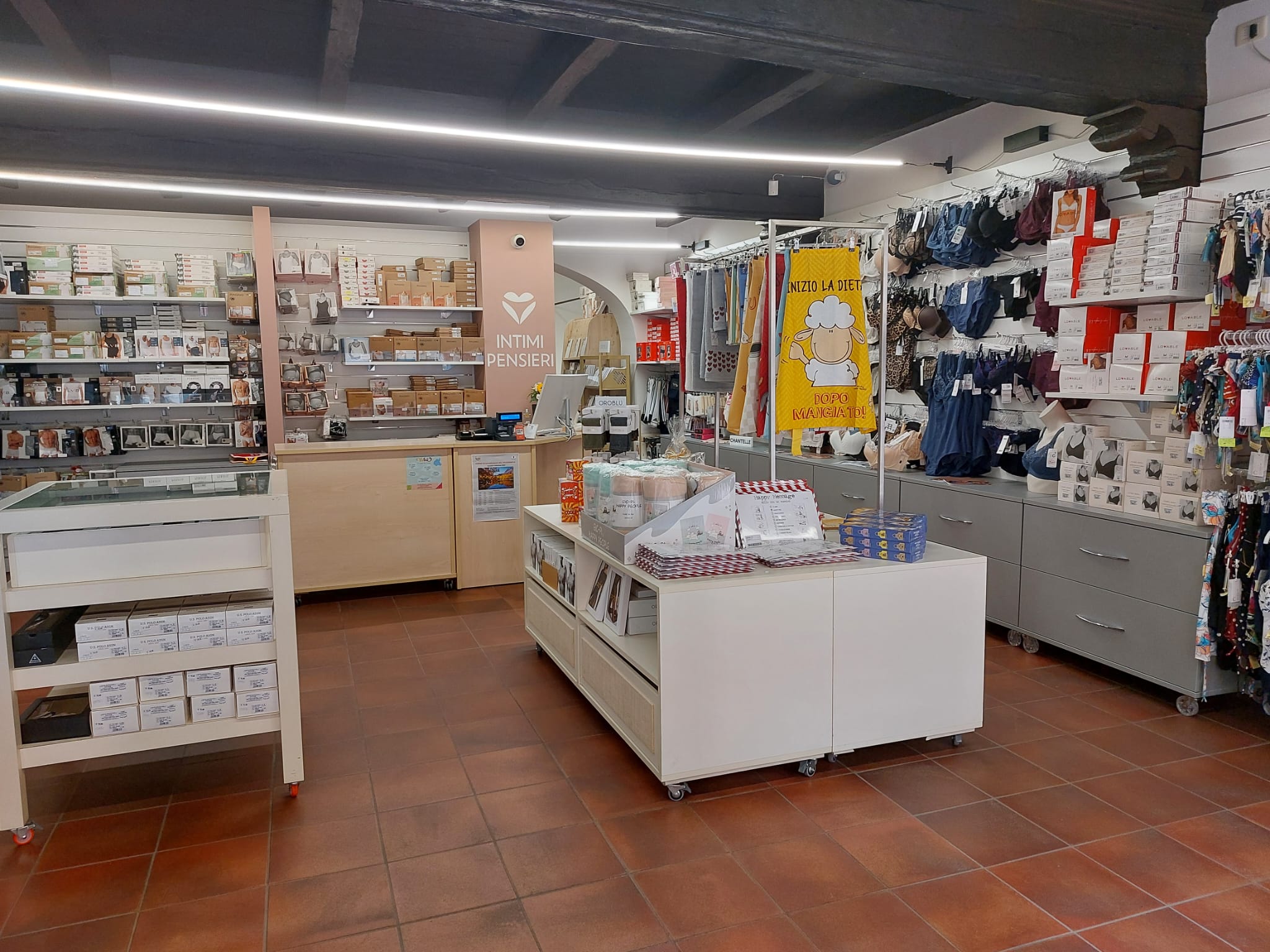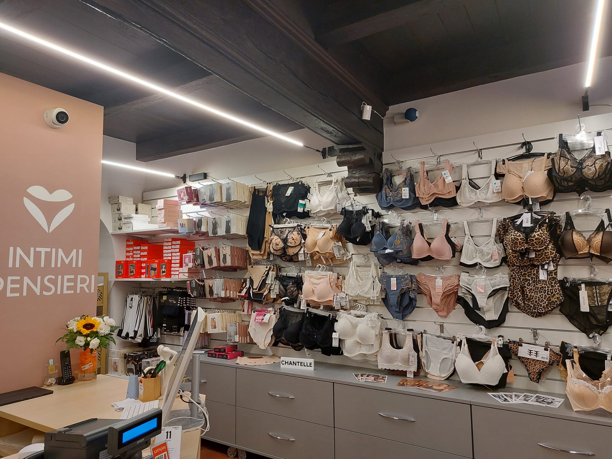 La merce è esposta a vista: l’assortimento di Intimi Pensieri offre prevalentemente sulla corsetteria in coppe differenziate. Per questa categoria di prodotto, Anita, Chantelle e Krisline sono i marchi principali offerti dalla proprietaria che lo scorso marzo ha anche ottenuto il diploma di brafitter rilasciato dalla società inglese Pudding Lingerie. Presenti anche linee mare, pigiameria e intimo maschile.