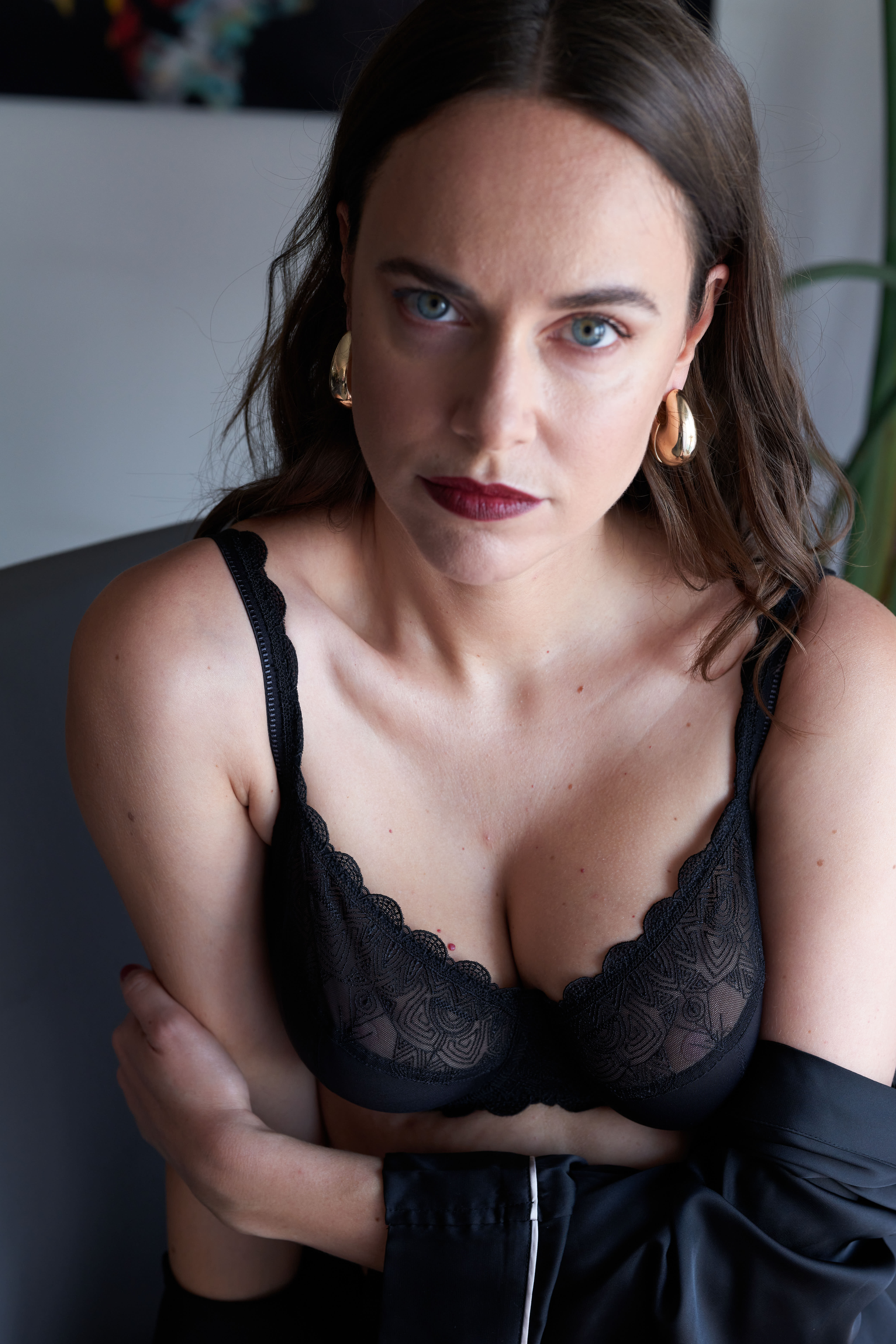Il primo reggiseno è corredato di ferretto, vanta coppe tripartite e ricamate in balza di pizzo elasticizzata a effetto geometrico, mentre il modello Fiona, con ferretto, accentua il décolleté. La mutanda Fabiana, con inserti trasversali nei fianchi, in balza di pizzo elasticizzato dal disegno geometrico.