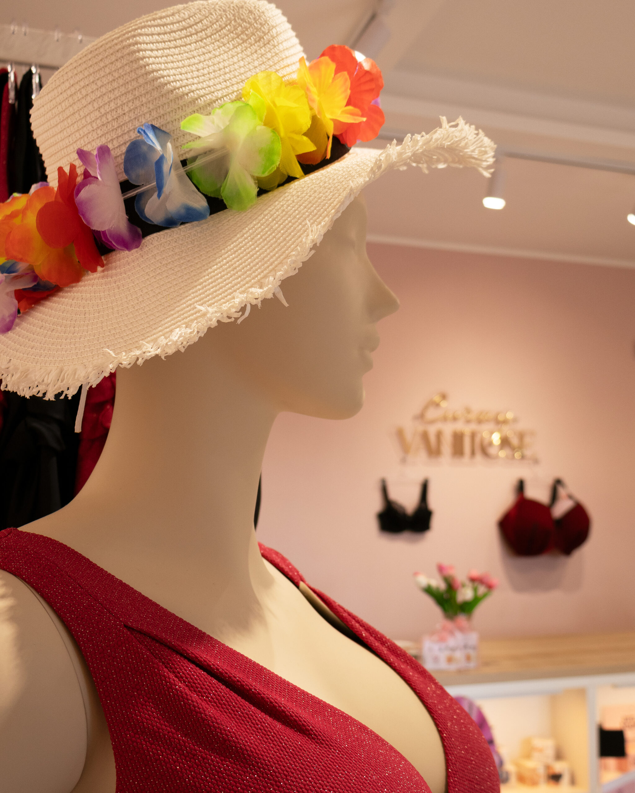 La prima è dedicata alle linee di corsetteria stagionale, dove a farla da padrone sono i colori forti e vivaci: dal fucsia al blu elettrico pe arrivare al rosso. A questo spazio se ne affianca un altro riservato alle linee continuative, nelle tonalità basic bianco, nero e nudo, fino ad arrivare alla parete dedicata alle linee shapewear. In virtù della stagione in corso, una parte importante del punto vendita è dedicata alle linee di costumi da bagno.