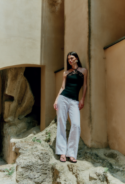 Tutta la collezione si muove in un universo visivo etereo e sognante, costruito attorno a una palette delicata e luminosa. Tonalità pastello come vaniglia, pistacchio, lavanda e acqua si intrecciano ai bianchi puri e alle nuance più terrose e avvolgenti del beige e del brownie. I capi, pensati per essere abbinabili tra loro con facilità, sono versatili e adatti a ogni momento della giornata.